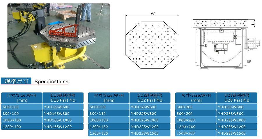 D16/D28 三維柔性八角臺(tái)復(fù)雜的面體設(shè)計(jì)讓它具備了多方向空間擴(kuò)展這一功能從而滿(mǎn)足部分 焊接件的工藝要求,同時(shí)局限了它的規(guī)格大小和使用范圍。D16/D28 三維柔性八角臺(tái)一般配合變位機(jī)機(jī)器人焊接和旋轉(zhuǎn)機(jī)構(gòu)焊接使用,主要用于多面體同工序焊接件焊接,它的效率可達(dá)普通工裝的三倍以上。